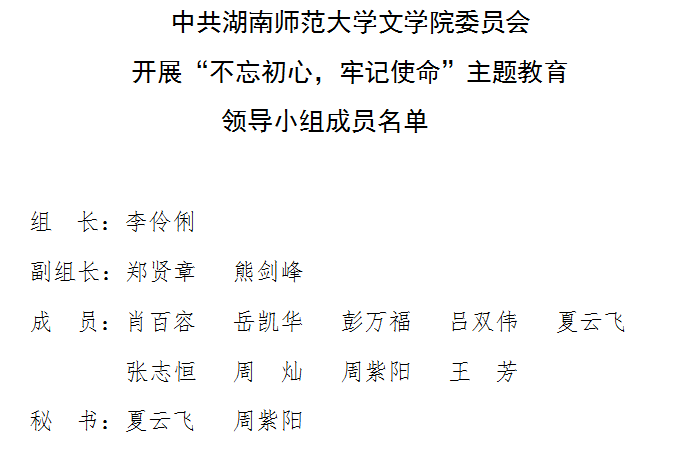 中共湖南师范大学文学院委员会开展“不忘初心,牢记使命”主题教育领导小组成员名单