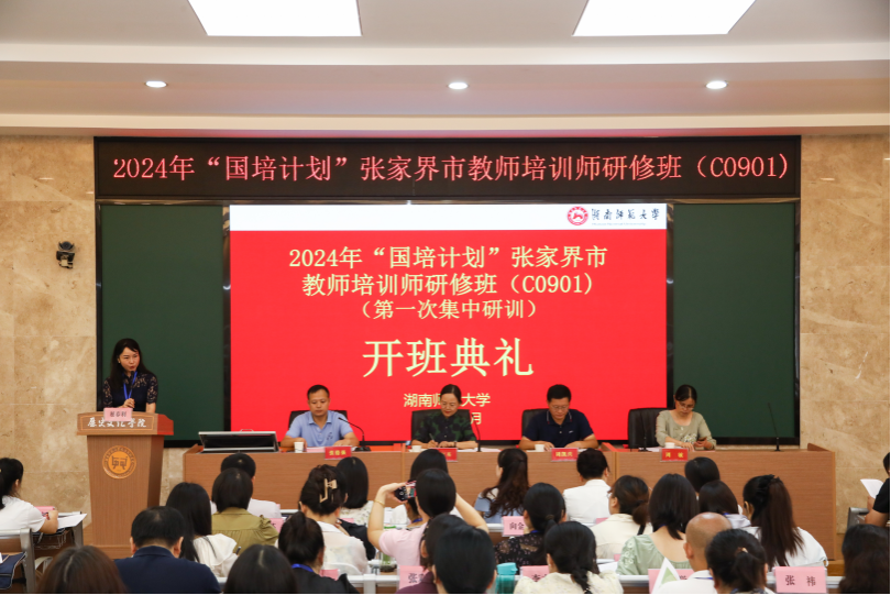 8月19日上午,2024年“国培计划”张家界市教师培训师研修班在文渊楼203报告厅举行开班仪式。湖南师范大学文学院副院长周凯兴、文学院副教授周敏、张家界市师资培训中心主任佘红英、张家界市国培市级管理员刘双全以及44名学员参加开班仪式。