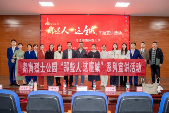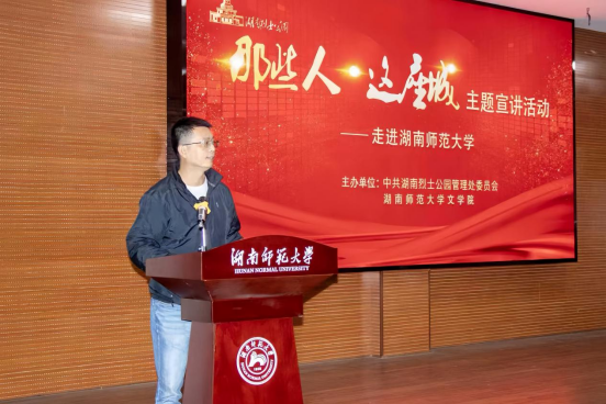 (通讯员李昊谢宇熹)为深入贯彻落实习近平总书记关于高校思政课建设的重要指示精神,11月10日下午,文学院联合湖南烈士公园管理处在张公岭校区图书馆举办“那些人,这座城”系列宣讲活动。文学院党委书记熊剑峰,党委副书记刘宓蜜,学工办主任、2025级辅导员周灿,2023级辅导员陈天歆,湖南烈士公园管理处党委书记肖胜,党委委员、管理处副主任吴小芳,文物保护部部长张晨、副部长张栋出席。湖南烈士公园管理处演职人员罗洋、陈晓东、彭新元、张烁今,湖南师范大学文学院志愿宣讲员孔迓熹及文学院合唱团参与演出,杨倩担任主持,2025级全体学生参加活动。