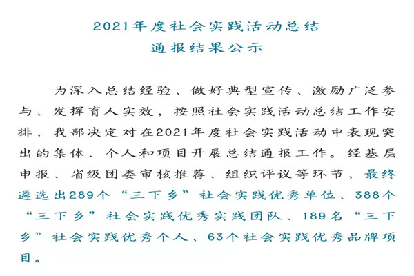 (通讯员 胡娟)12月10日,共青团中央青年发展部公示2021年度社会实践活动通报结果,我院团委获评“三下乡”社会实践优秀单位。为深入总结经验、做好典型宣传、激励广泛参与、发挥育人实效,共青团中央青年发展部决定对在2021年度社会实践活动中表现突出的集体、个人和项目开展总结通报工作。据悉,在此次总结通报工作中,经基层申报、省级团委审核推荐、组织评议等环节,最终全国遴选出289个“三下乡”社会实践优秀单位。