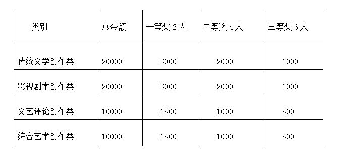 第一条 “新青年文学艺术创作奖”共设传统文学创作类、影视剧本创作类、文艺评论创作类、综合艺术创作类4个类别奖项。“新青年文学艺术创作奖”每学年评选一次,评选时间为每学年10月份。