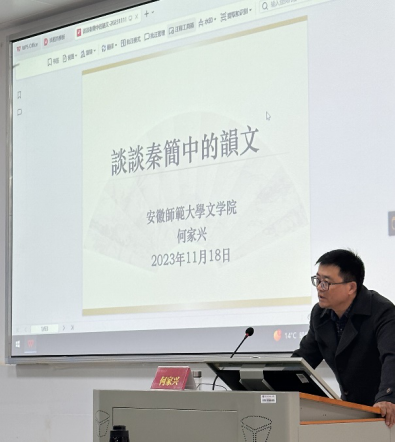 (通讯员 陈斌 陈心如)11月18日上午,我院特邀安徽师范大学教授、博士生导师,复旦大学出土文献与古文字研究中心博士后研究人员何家兴教授为我院师生带来“谈谈秦简中的韵文”的精彩讲座。本次讲座在文学院302室举行,由我院教授杨合林主持,相关专业教师和数十位本科生、研究生到场聆听。