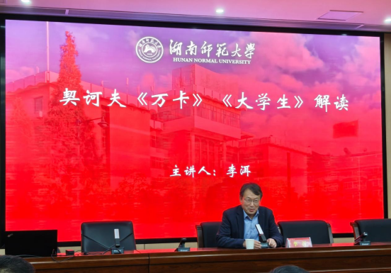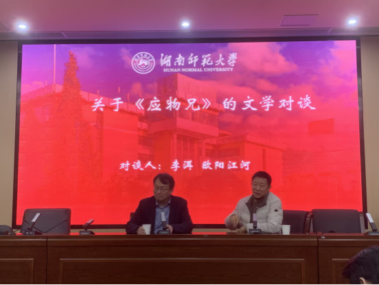 (通讯员 李晨玮)11月19日晚,著名作家李洱和欧阳江河联袂登台文学院“智慧之光”名师大讲堂,在216报告厅开展题为“契诃夫《万卡》《大学生》解读”和“当代性视野下的《应物兄》写作”的讲座和对谈活动。文学院副院长岳凯华教授主持,湖南省作协副主席马笑泉、诗人雪马及我院李作霖、许永宁、李婕、陈展等教师现场参会。