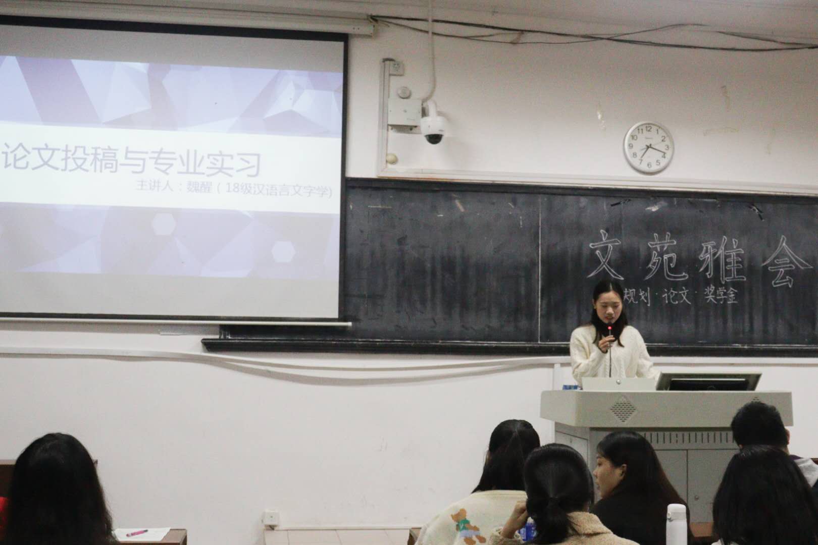 (通讯员郭帆)10月21日晚7点,文学院研究生学生会在文学院317举办了第二届“文苑雅会”学术沙龙活动。本次沙龙围绕“规划•论文•奖学金”主题展开,主讲人分别是18级写作学专业聂文涛、18级当代文学专业李岳峰、18级汉语言文字学专业魏醒以及19级现代文学专业申晓。本次沙龙由学术部郑明月主持。